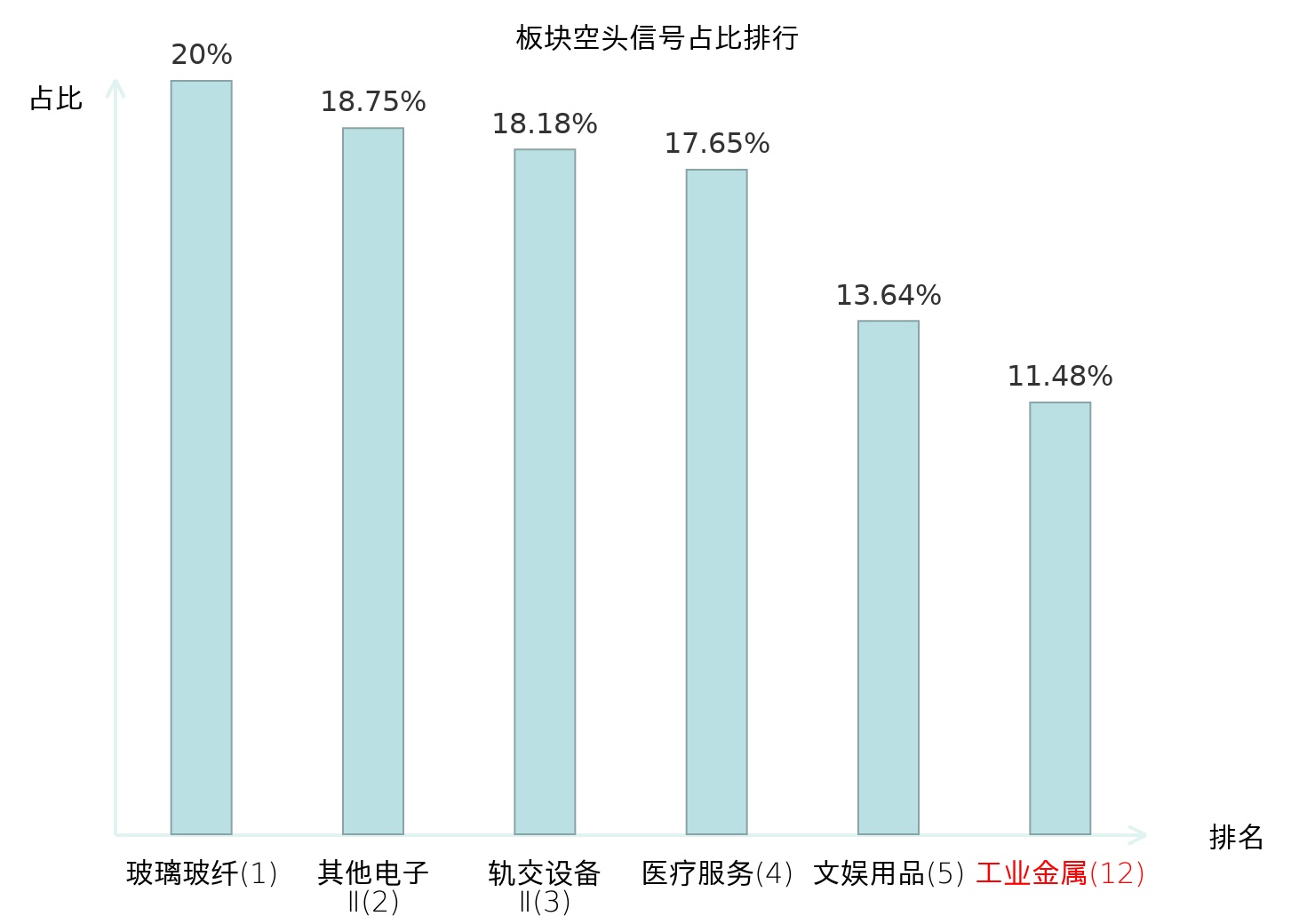 全市场所有行业板块中主力空头信号占比排名中,玻璃玻纤板块位居第一。医疗服务板块名次提升最快,较昨日上升126位。