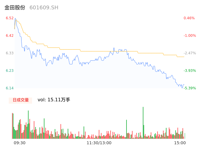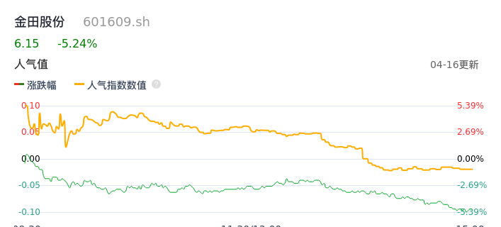 04月16日,金田股份收报6.15,股价涨幅-5.24%,成交金额9530.83万元,换手率1.03%。