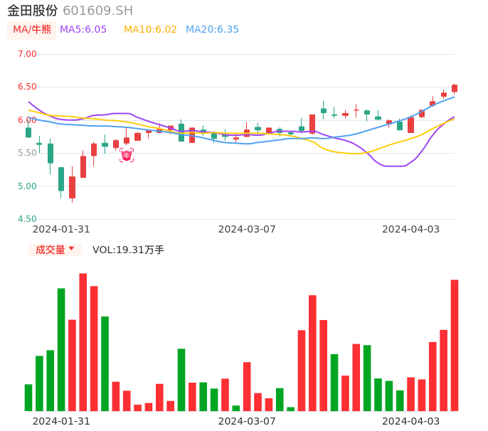 04月03日,金田股份收报6.53,股价涨幅1.87%,成交金额1.25亿元,换手率1.31%。