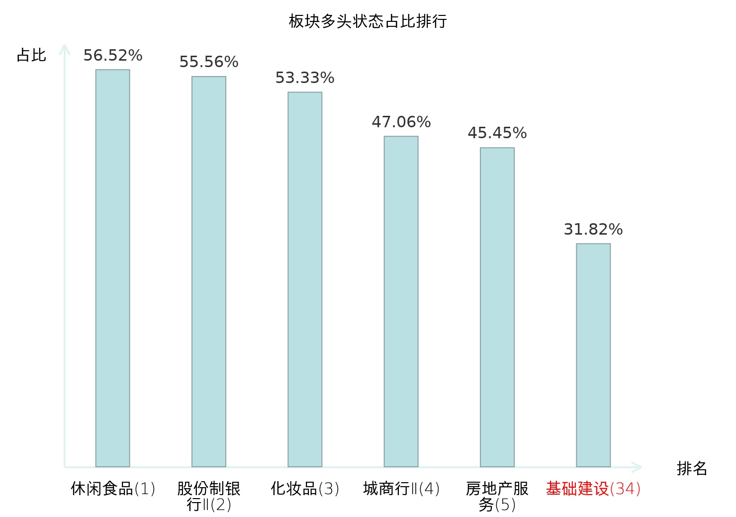 全市场所有行业板块中主力多头状态占比排名中,休闲食品板块位居第一。汽车服务板块名次提升最快,较昨日上升90位。