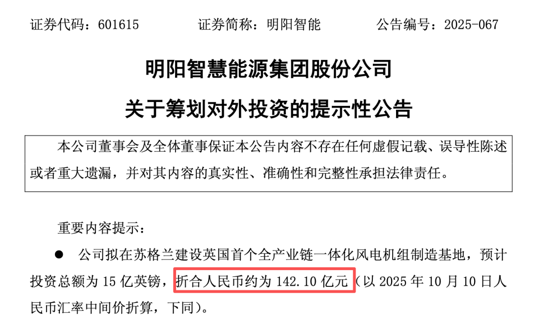 明阳智能(601615)10月12日晚公告,公司拟在苏格兰建设英国首个全产业链一体化风电机组制造基地,预计投资总额为15亿英镑,折合人民币约为142.1亿元,将用于建设海上与漂浮式风电机组制造工厂。据介绍,该计划预计分三个阶段进行:第一期:建设先进的风电机舱与叶片制造厂,计划2028年底实现首批投产;第二期:扩建生产线,加速英国漂浮式风电技术的规模化生产;第三期:进一步扩展至控制系统、电子设备及其他关键部件的生产制造。该项目的资金来源于公司自有资金、自筹资金(包括但不限于公司2022年发行全球存托凭证募集的资金及未来银行融资)。截至目前,公司已就该投资计划与英国政府和苏格兰政府进行了深入讨论,并与英国国家能源公司(Great British Energy)、国家财富基金(National WealthFund)、苏格兰国家投资银行(Scottish National Investment Bank)、英国王室地产署(The Crown Estate)及英国出口信贷署(UK Export Finance)进行了详细的商业磋商。谈及本次对外投资对公司的影响时,明阳智能表示,海外市场潜力巨大,走向海外寻求新的业务增长点是公司积极推进国际化战略的重要一步。公司始终坚定深耕海上和海外两个市场,通过本次海外建立生产基地,有利于公司打造一个服务于英国、欧洲及其他非亚洲市场的海上风电中心,推动公司成为全球海上风电产业的重要参与者。本次投资将公司先进的海上风电技术引入北海区域,有助于加速漂浮式风电技术的商业化进程。通过在当地设立完整的生产和服务体系,公司将推动可再生能源产业链的关键环节在英国落地,增强自身在全球海上风电技术标准制定和产业升级中的引领地位。本次拟海外建厂将为当地创造更多就业岗位,助力公司海外业务本地化和人才属地化。公司漂浮式风电技术也将对英国实现其清洁能源转型目标提供有力支撑,符合全球碳中和趋势和各国绿色能源发展政策导向。明阳智能同时提醒,本次对外投资事项存在不确定性,不排除因无法获得批准导致本次投资项目终止。该投资计划涉及国际情况复杂、建设周期较长、投资金额大,对公司利润的影响无法准确预计。项目在建设中可能会出现建设成本增加、建设进度延迟等风险。欧洲与中国在法律制度、地缘政治、政策体系、商业环境、文化特征等方面存在一定差异,该项目未来经营过程中可能面临海外市场竞争、人才团队建设、 内部运营管理等诸多挑战,存在一定的海外经营与管理风险。本次投资涉及境外投资,项目投资建设以及项目未来收入可能需通过外币进行结算,存在因汇率波动带来的风险。明阳智能曾在召开业绩说明会时表示,公司积极拓展海外市场。2025年上半年,公司新增海外订单1.68GW,公司海外在手订单约达5GW。公司根据行业趋势、市场环境及战略需求等多重因素综合考虑,如后续推进相关计划,公司将严格遵循相关法律法规,及时、准确履行信披义务。