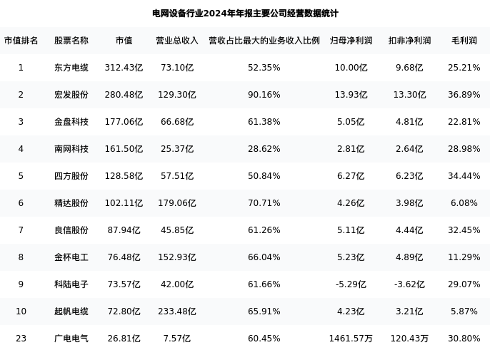 广电电气最新报告期数据为年报,下表汇总了电网设备行业内市值靠前的公司年报主要经营数据