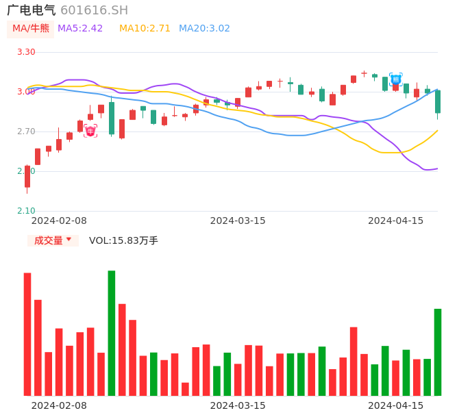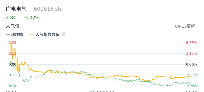 04月15日,广电电气收报2.84,股价涨幅-5.02%,成交金额4554.23万元,换手率1.85%。