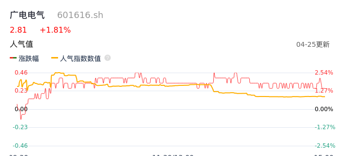04月25日,广电电气收报2.81,股价涨幅1.81%,成交金额2382.25万元,换手率1.00%。