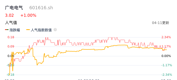 04月11日,广电电气收报3.02,股价涨幅1.00%,成交金额2539.21万元,换手率0.98%。