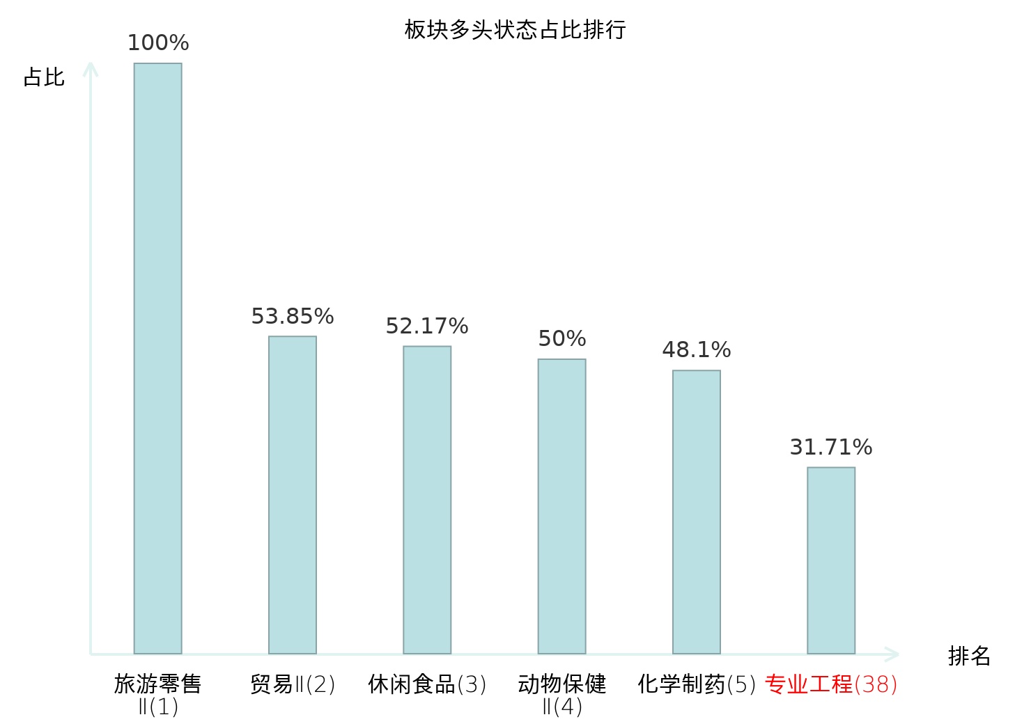 全市场所有行业板块中主力多头状态占比排名中,旅游零售Ⅱ板块位居第一。白酒Ⅱ板块名次提升最快,较昨日上升47位。