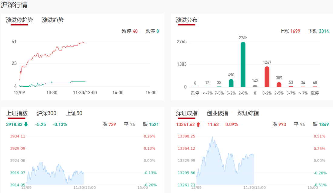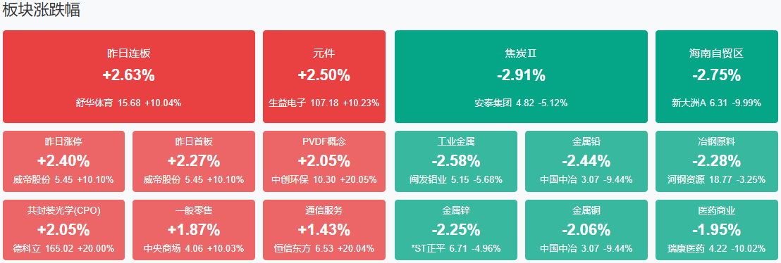 三大指数早盘涨跌不一,沪指窄幅震荡,创业板指涨超1%。沪深两市半日成交额1.26万亿,较上个交易日缩量347亿。全市场超3500只个股下跌。从板块来看,算力硬件概念再度爆发,胜宏科技涨近9%,德科立20cm涨停。福建板块延续强势,安记食品6连板,舒华体育4连板,东百集团、厦门港务双双3连板。零售板块表现活跃,茂业商业、中央商场相继涨停。下跌方面,海南本地股集体大跌,新大洲A跌停。有色金属板块震荡走弱,中国中冶触及跌停。