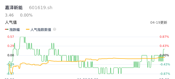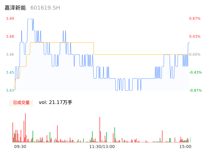 04月19日,嘉泽新能收报3.46,股价涨幅0.00%,成交金额7315.63万元,换手率0.87%。