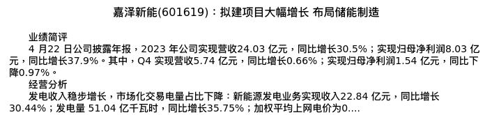 值得注意的是:2024年04月国金证券的姚遥/宇文甸分析师,首次发布关于嘉泽新能的研究报告,标题为:嘉泽新能(601619):拟建项目大幅增长 布局储能制造。