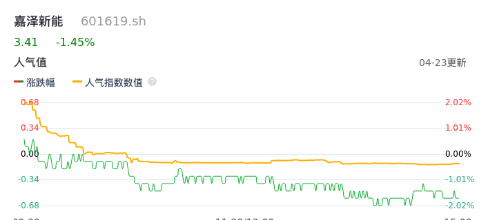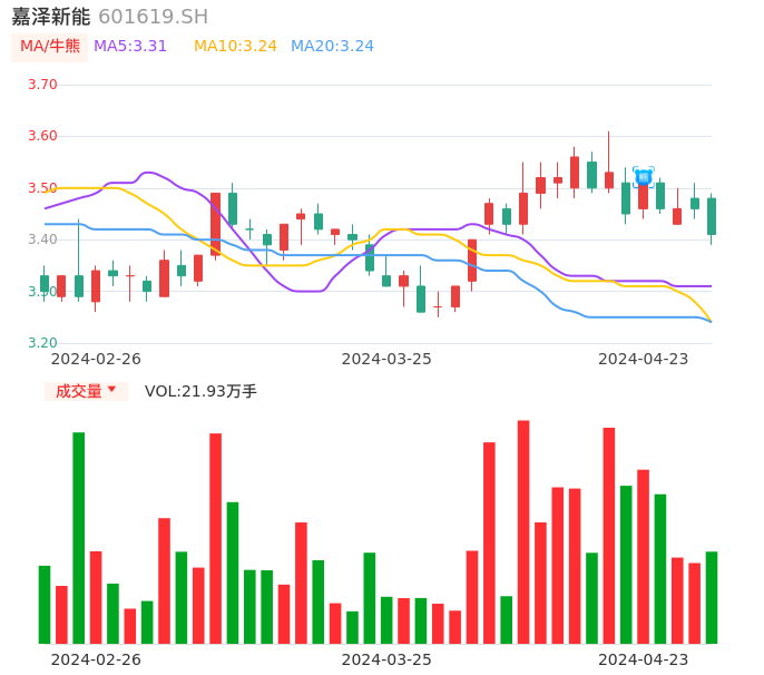 04月23日,嘉泽新能收报3.41,股价涨幅-1.45%,成交金额7521.61万元,换手率0.91%。