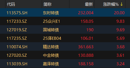 上证报中国证券网讯 11月11日,中证转债指数收盘下跌0.16%,报491.1点。涨幅方面,东时转债、国城转债、精达转债、中金转债、嘉泽转债涨幅居前,分别涨20.00%、9.69%、3.68%、3.61%、3.24%。下跌方面,航宇转债、楚天转债跌幅居前,分别跌3.47%、2.98%。