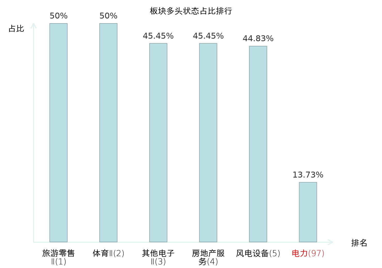 全市场所有行业板块中主力多头状态占比排名中,旅游零售Ⅱ板块位居第一。其他家电Ⅱ板块名次提升最快,较昨日上升112位。