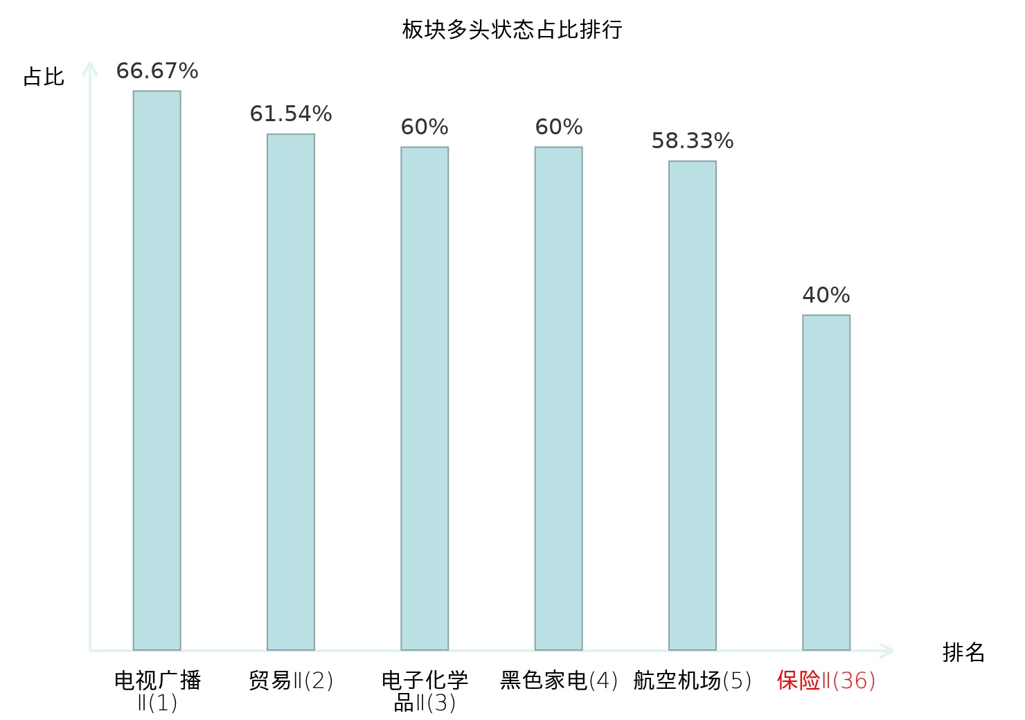 全市场所有行业板块中主力多头状态占比排名中,电视广播Ⅱ板块位居第一。黑色家电板块名次提升最快,较昨日上升80位。