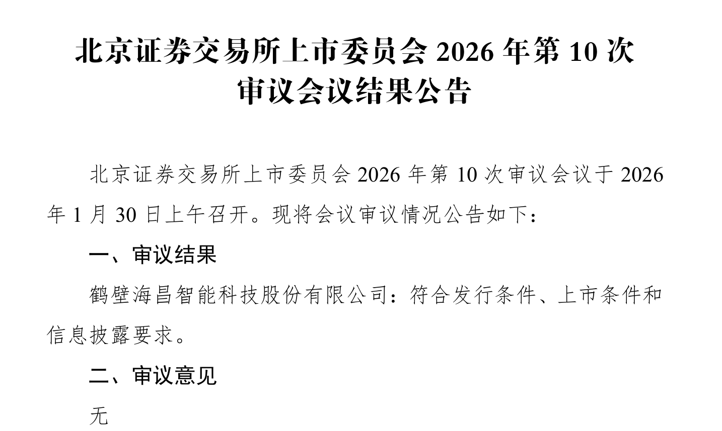 上证报中国证券网讯 1月30日盘后,海昌智能发布北京证券交易所上市委员会2026年第10次审议会议结果公告。结果显示,鹤壁海昌智能科技股份有限公司(首发)符合发行条件、上市条件和信息披露要求。