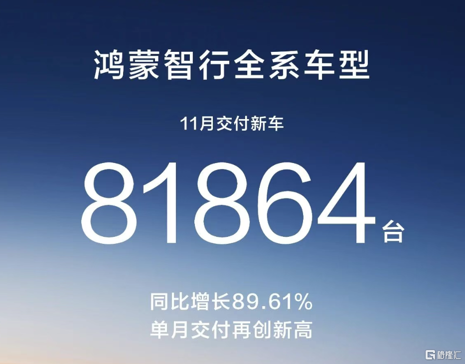 11月,鸿蒙智行表现抢眼,其全系车型(含问界、智界等五大品牌)交付新车81,864台,同比增长89.61%,创下单月交付历史新高。