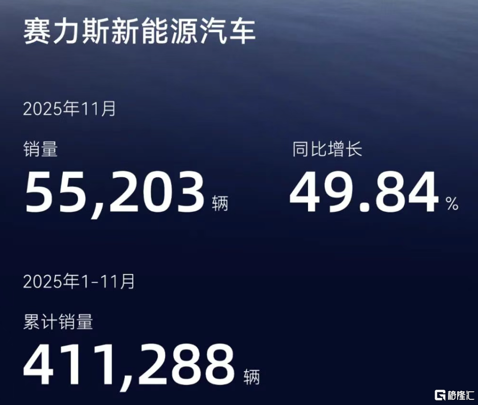 11月,赛力斯新能源汽车销量55203辆,同比增长49.84%,再创历史新高;今年1-11月累计销量达411288辆。