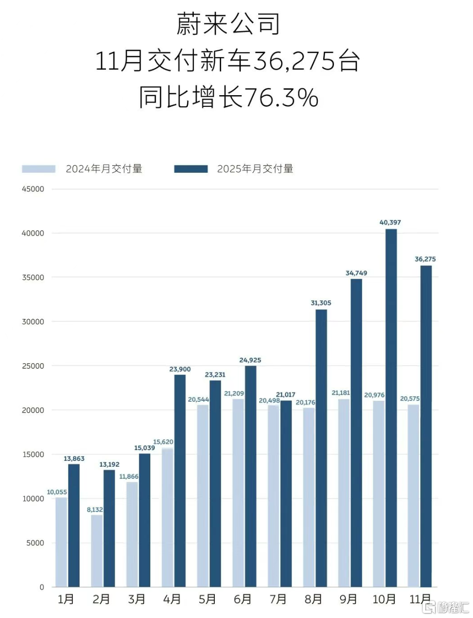 蔚来汽车11月交付新车36,275台,同比增长76.3%。其中,蔚来品牌交付新车18,393台;乐道品牌交付新车11,794台;firefly萤火虫品牌交付新车6,088台。截至目前,蔚来公司已累计交付新车949,457台。其中,蔚来品牌累计交付新车797,712台;乐道品牌累计交付新车119,415台;firefly萤火虫品牌累计交付新车32,330台。