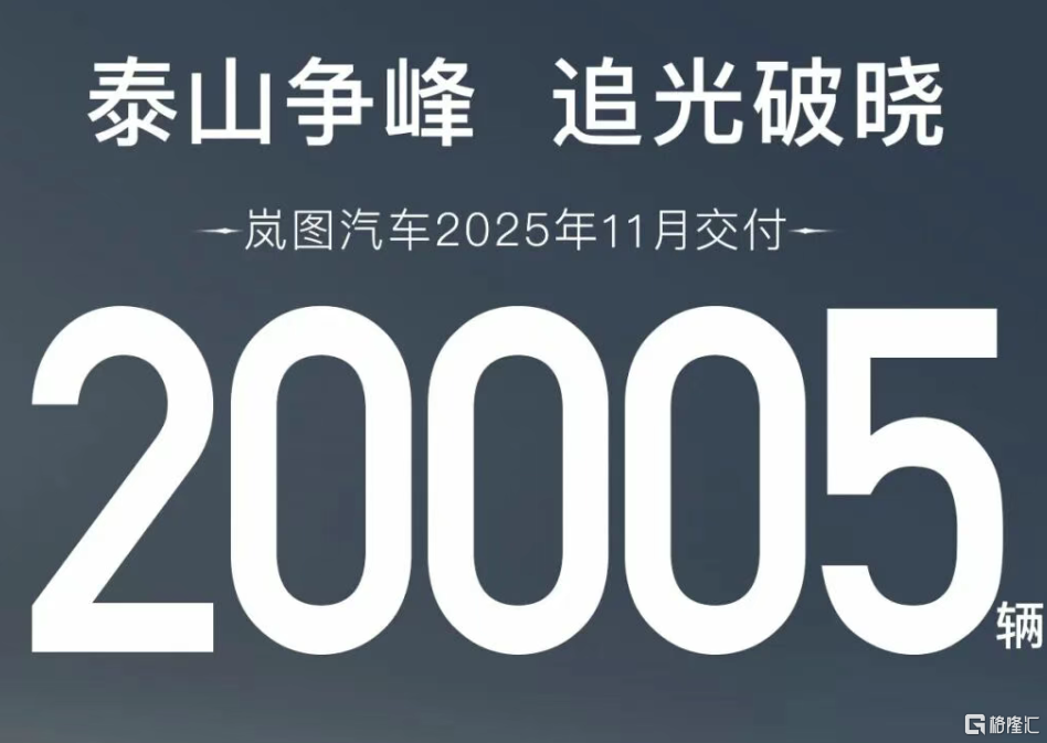 岚图汽车11月交付新车20005辆,同比增长84%,系品牌单月交付量首次突破2万辆大关,并实现连续10个月环比增长。