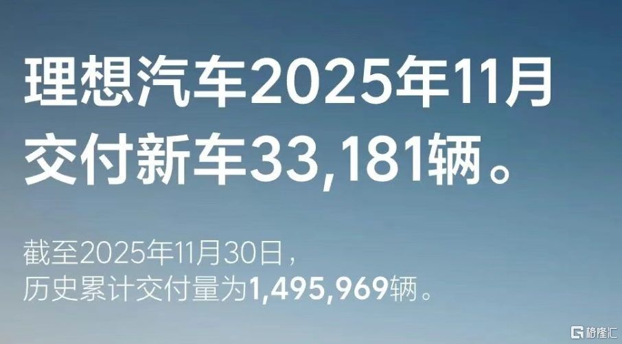 而理想汽车11月交付新车33,181辆,环比升4.5%。截至2025年11月30日,理想汽车历史累计交付量为1,495,969辆。