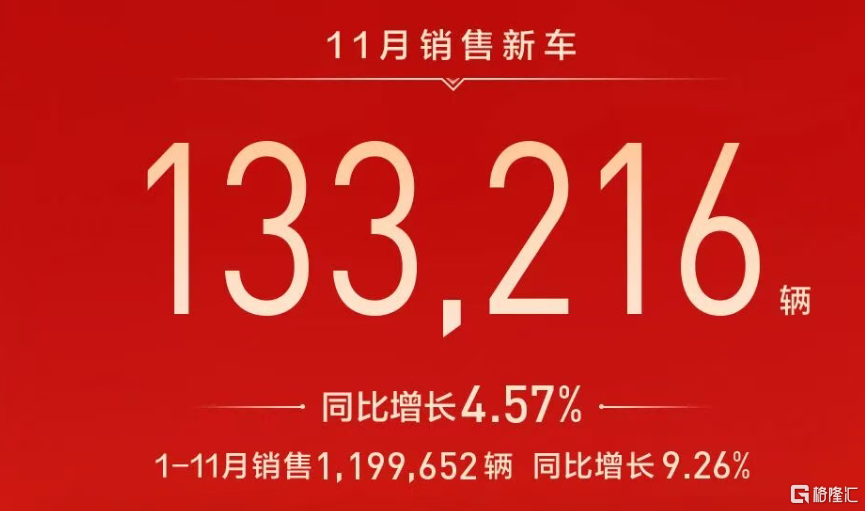 此外,长城汽车11月汽车销量13.32万辆,同比增长4.57%;11月新能源汽车销量40113辆。