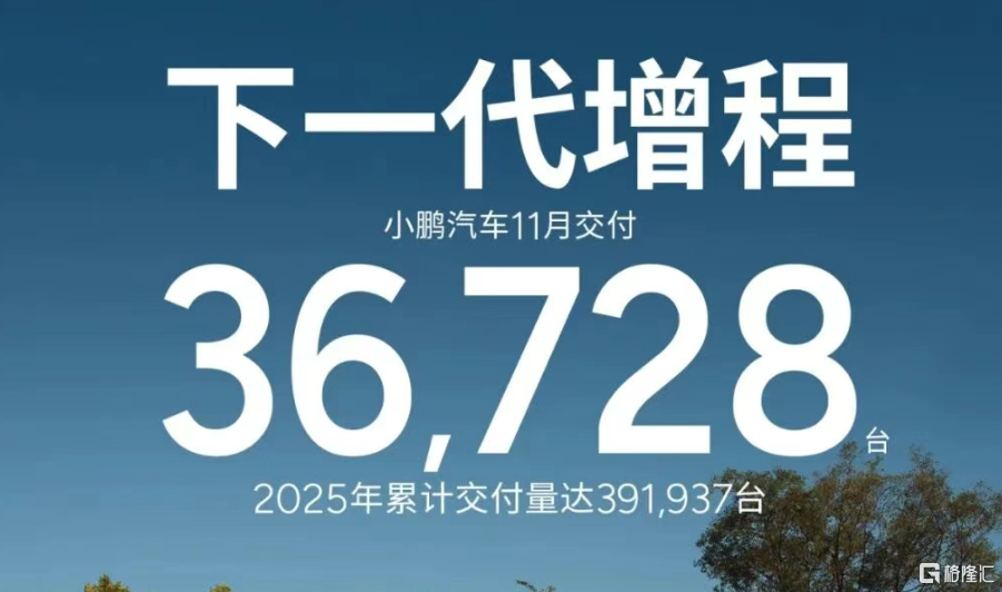 此外,小鹏汽车11月交付智能电动汽车36,728辆,同比增长19%。2025年1月至11月累计交付量达391,937辆,同比增长156%。