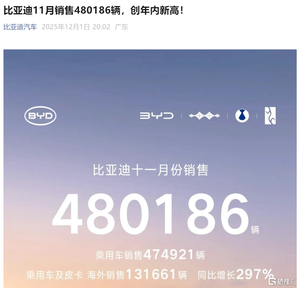 新能源车企方面,比亚迪11月以480,186辆的销量位居榜首。今年1-11月汽车累计销量418.2万辆,同比增长11.3%。