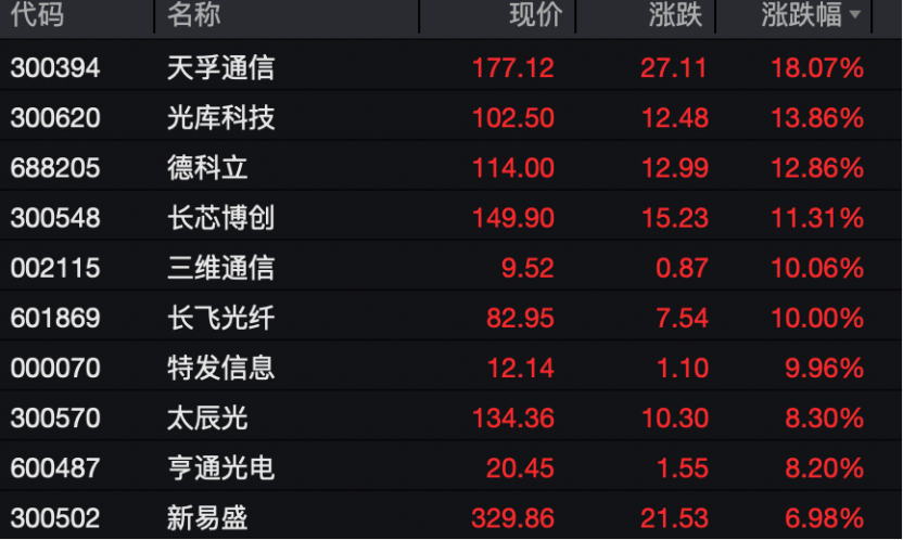 具体行业板块和赛道方面,若按照申万一级行业划分,通信板块整体领涨,板块盘中涨幅超过4%,天孚通信盘中触及“20cm”涨停,德科立盘中涨幅一度超过18%。三维通信、长飞光纤、特发信息等多股盘中均涨停,另有多股涨幅超过5%。