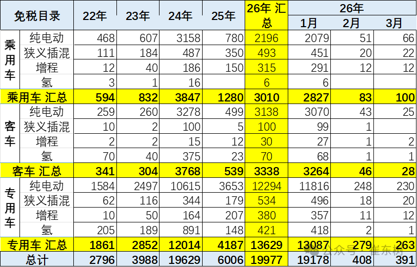 智通财经APP获悉,乘联分会秘书长崔东树发文称,2026年1-3月新能源车免税目录共有19977款,其中3月有391款新车型,相对历年同期均有上升,目录资源丰富。2026年3月的换电车型不多,主要集中于专用车。增程和纯电动的电池高能量密度的产品较丰富。2024年下半年以来乘用车没有氢燃料新车型推出。2026年汽车增程类车型较丰富,商用车的重卡类增程车型也大量推出。自主传统车企的有竞争力的新能源车型推出较多。