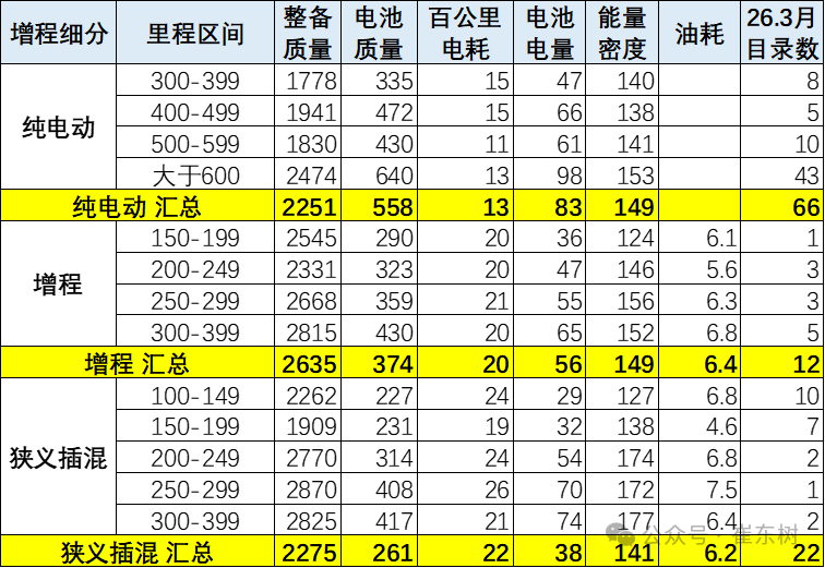 插混和增程的电耗较高,狭义插混车型平均百公里耗电22度,增程车型平均百公里耗电20度。
