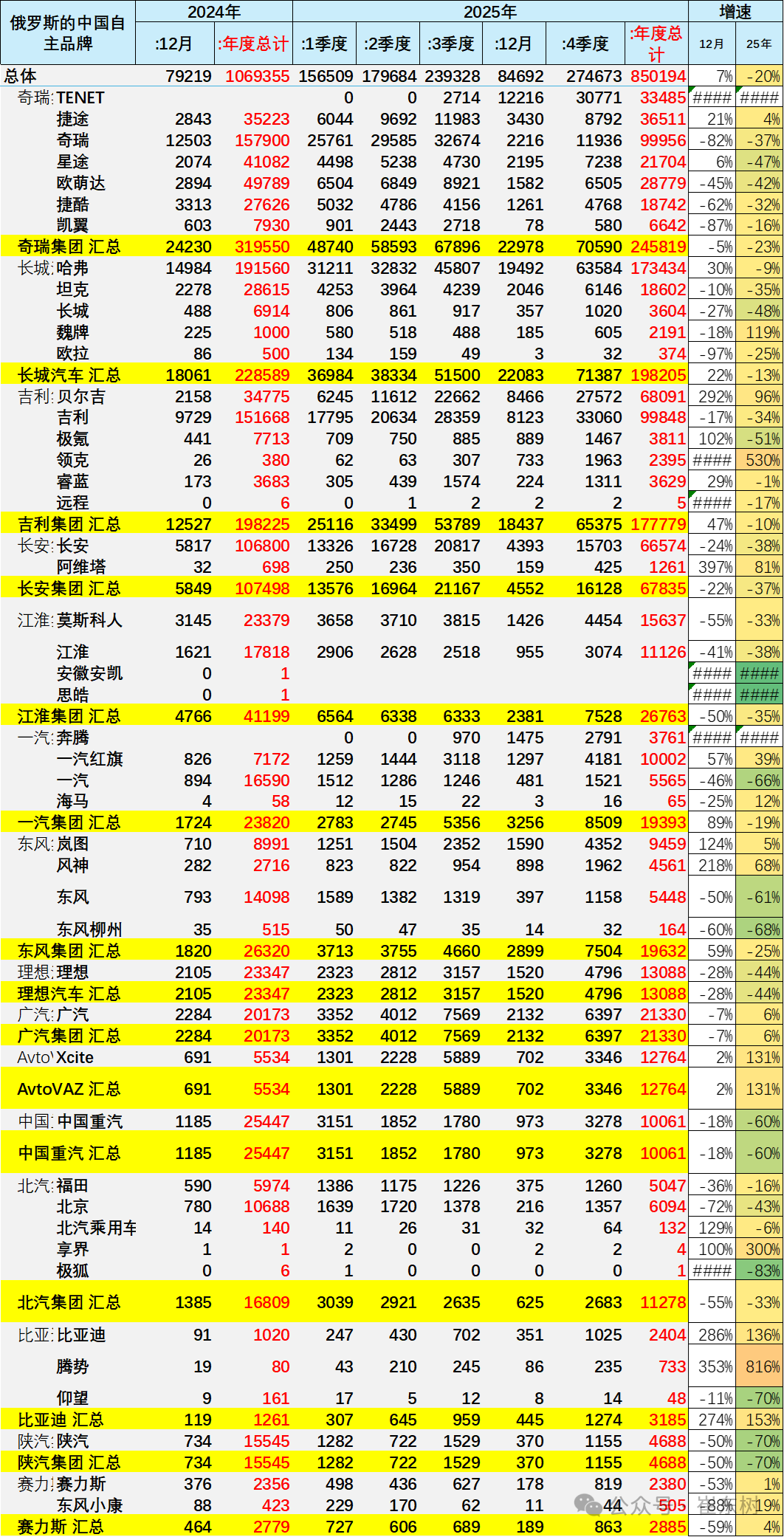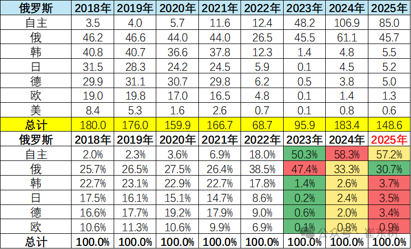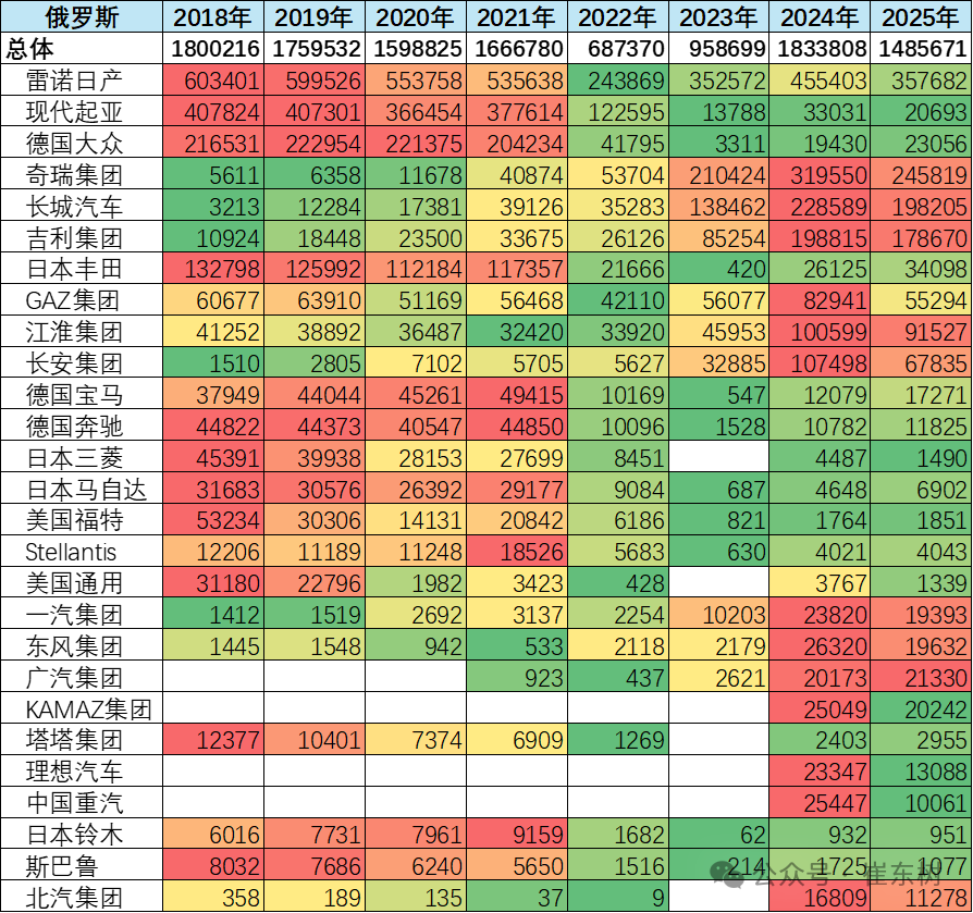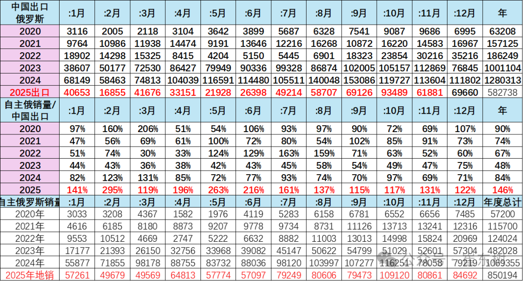 2023年中国出口俄罗斯100万辆,自主的俄罗斯市场销量48万辆,销量是中国自主出口量的48%。2024年中国出口俄罗斯128万辆,自主的俄罗斯市场销量107万辆,自主的俄罗斯市场销量是中国自主出口量的84%。2025年1-12月中国出口俄罗斯58.3万辆,自主品牌俄罗斯销量85.0万辆,当地销量是中国出口的146%,终于实现了大幅去库存的走势。