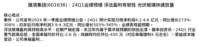 值得注意的是:2024年04月广发证券的邹戈/谢璐分析师,首次发布关于旗滨集团的研究报告,标题为:旗滨集团(601636):24Q1业绩预增 浮法盈利有韧性 光伏玻璃快速放量。