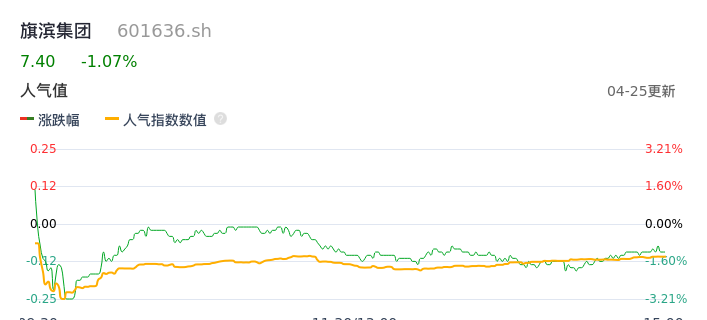 04月25日,旗滨集团收报7.40,股价涨幅-1.07%,成交金额2.88亿元,换手率1.45%。