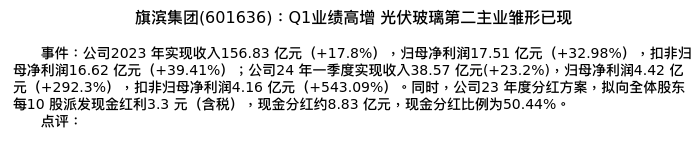 值得注意的是:2024年04月德邦证券的闫广分析师,首次发布关于旗滨集团的研究报告,标题为:旗滨集团(601636):Q1业绩高增 光伏玻璃第二主业雏形已现。