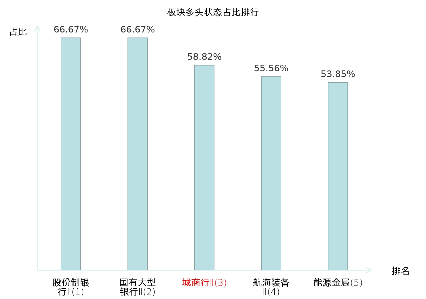 全市场所有行业板块中主力多头状态占比排名中,股份制银行Ⅱ板块位居第一。渔业板块名次提升最快,较昨日上升61位。