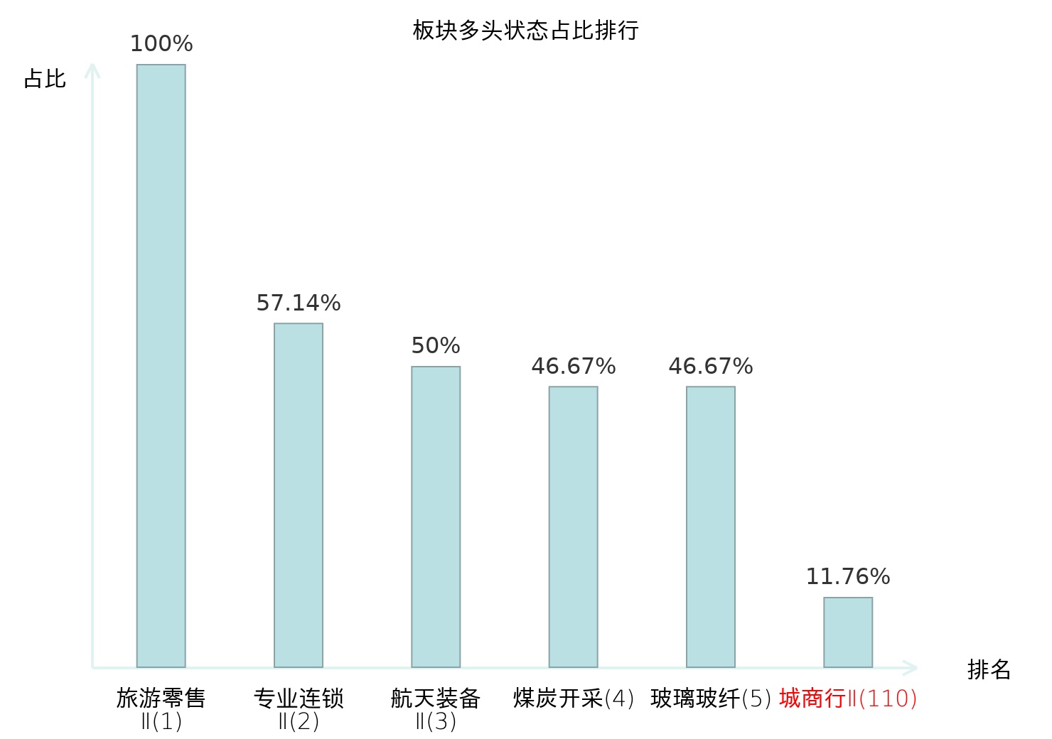 全市场所有行业板块中主力多头状态占比排名中,旅游零售Ⅱ板块位居第一。普钢板块名次提升最快,较昨日上升64位。