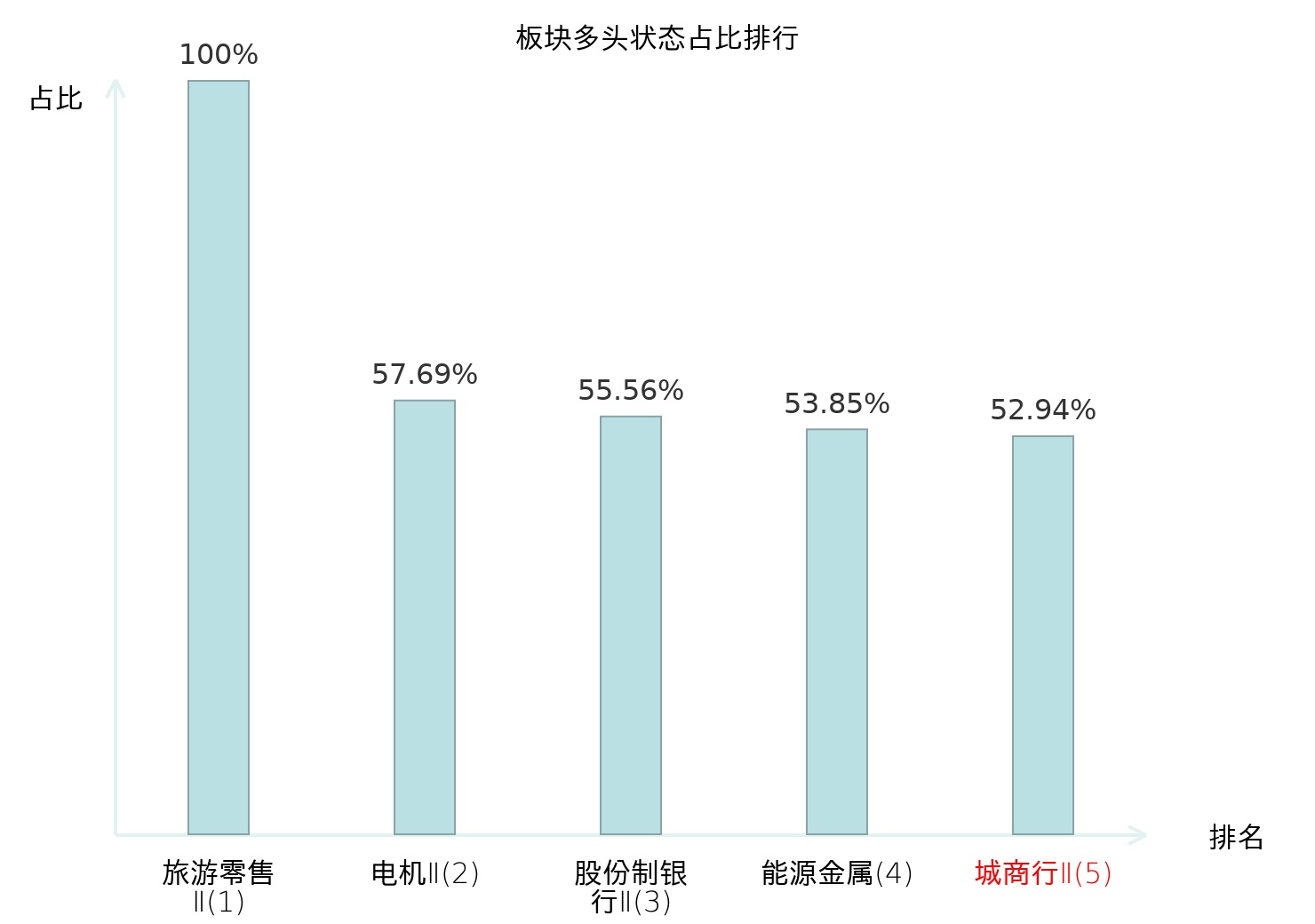 全市场所有行业板块中主力多头状态占比排名中,旅游零售Ⅱ板块位居第一。地面兵装Ⅱ板块名次提升最快,较昨日上升99位。