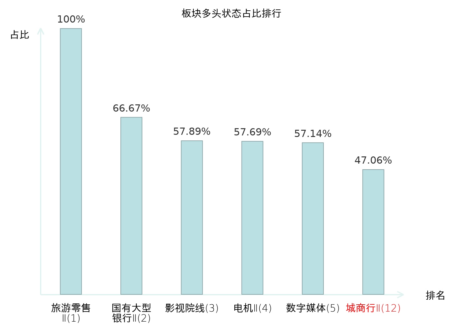 全市场所有行业板块中主力多头状态占比排名中,旅游零售Ⅱ板块位居第一。专业连锁Ⅱ板块名次提升最快,较昨日上升56位。