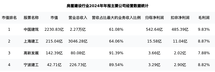 中国建筑最新报告期数据为年报,下表汇总了房屋建设行业内市值靠前的公司年报主要经营数据