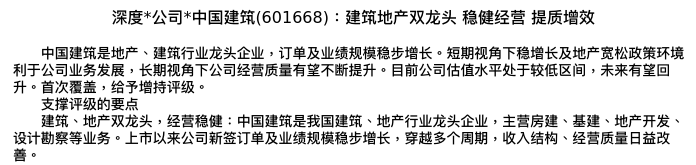 值得注意的是:2024年03月中银证券的陈浩武分析师,首次发布关于中国建筑的研究报告,标题为:深度*公司*中国建筑(601668):建筑地产双龙头 稳健经营 提质增效。
