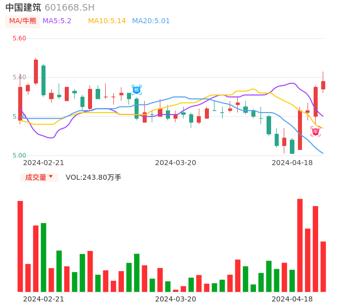 04月18日,中国建筑收报5.38,股价涨幅0.56%,成交金额13.12亿元,换手率0.59%。
