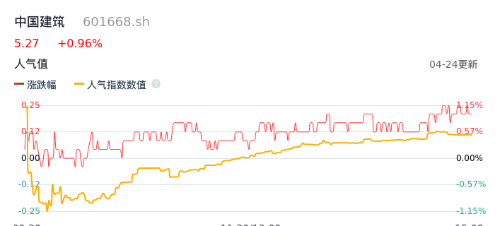 04月24日,中国建筑收报5.27,股价涨幅0.96%,成交金额7.40亿元,换手率0.34%。