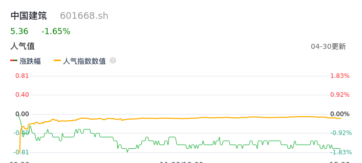 04月30日,中国建筑收报5.36,股价涨幅-1.65%,成交金额13.44亿元,换手率0.60%。