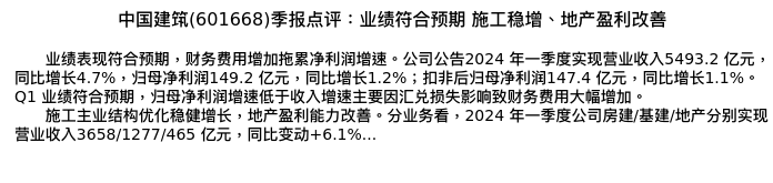值得注意的是:2024年04月国盛证券的何亚轩/程龙戈/廖文强/李枫婷分析师,首次发布关于中国建筑的研究报告,标题为:中国建筑(601668)季报点评:业绩符合预期 施工稳增、地产盈利改善。