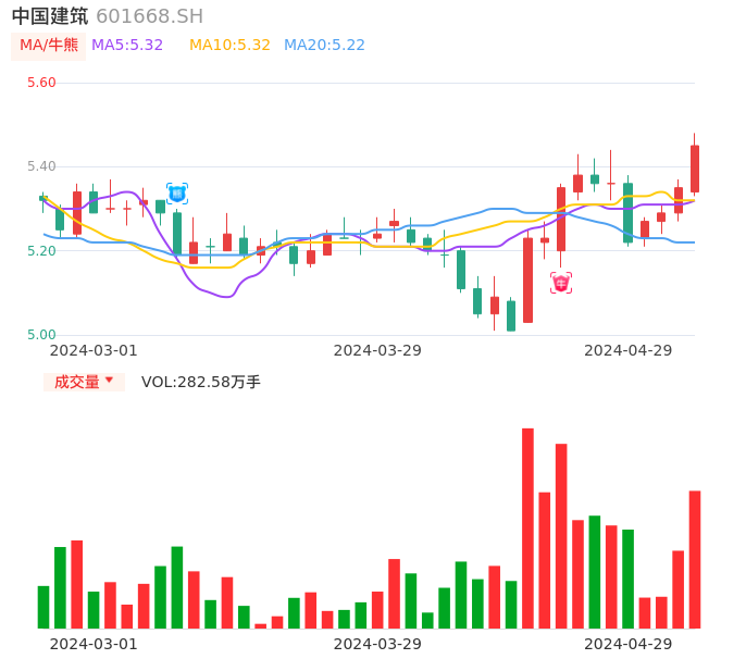 04月29日,中国建筑收报5.45,股价涨幅1.87%,成交金额15.33亿元,换手率0.68%。