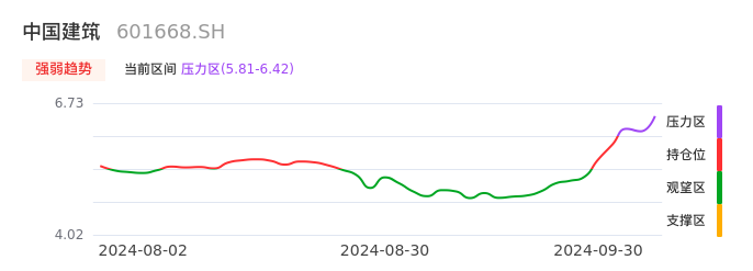 我们来看一下该股的九方特色指标强弱趋势的情况:中国建筑近日从持仓区进入压力区。股价出现一波快速拉升行情,目前上升动能较为充足可继续持股。注意今日上方压力位:6.42元是否能有效突破。