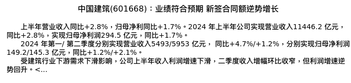值得注意的是:2024年09月国信证券的任鹤/朱家琪分析师,首次发布关于中国建筑的研究报告,标题为:中国建筑(601668):业绩符合预期 新签合同额逆势增长。