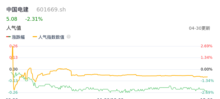 04月30日,中国电建收报5.08,股价涨幅-2.31%,成交金额9.33亿元,换手率1.40%。