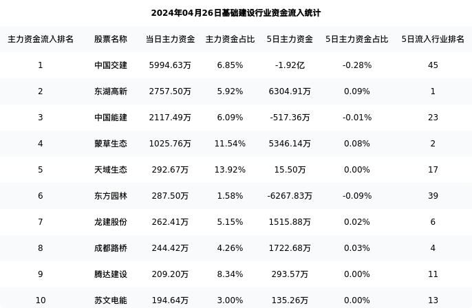 从主力资金流向来看,基础建设行业今日主力资金流入25.73亿元,在所有申万二级行业中排名:25/131。