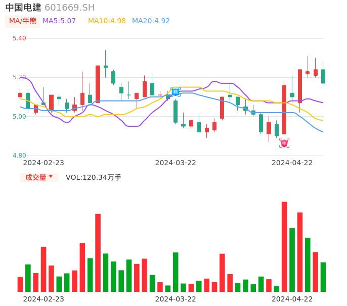 04月22日,中国电建收报5.17,股价涨幅-1.34%,成交金额6.28亿元,换手率0.92%。