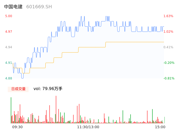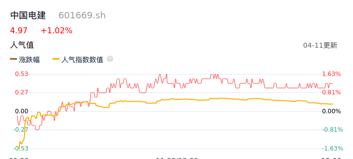 04月11日,中国电建收报4.97,股价涨幅1.02%,成交金额3.96亿元,换手率0.61%。